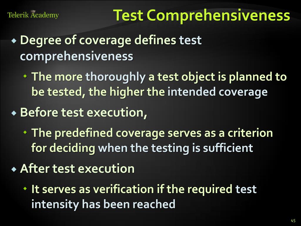 Test Comprehensiveness • Degree of coverage defines test comprehensiveness • The more thoroughly a test object is planned to be tested, the higher the intended coverage • Before test execution, • The predefined coverage serves as a criterion for deciding when the testing is sufficient • After test execution • It serves as verification if the required test intensity has been reached