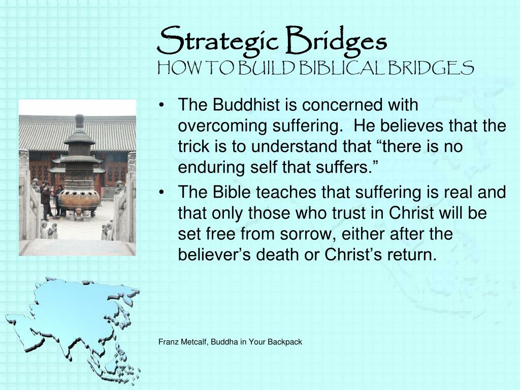 Strategic BridgesHOW TO BUILD BIBLICAL BRIDGES • The Buddhist is concerned with overcoming suffering. He believes that the trick is to understand that “there is no enduring self that suffers.” • The Bible teaches that suffering is real and that only those who trust in Christ will be set free from sorrow, either after the believer’s death or Christ’s return. Franz Metcalf, Buddha in Your Backpack