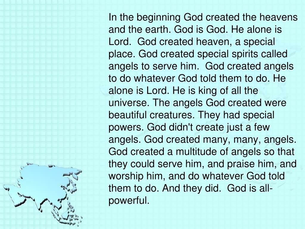 In the beginning God created the heavens and the earth. God is God. He alone is Lord. God created heaven, a special place. God created special spirits called angels to serve him. God created angels to do whatever God told them to do. He alone is Lord. He is king of all the universe. The angels God created were beautiful creatures. They had special powers. God didn't create just a few angels. God created many, many, angels. God created a multitude of angels so that they could serve him, and praise him, and worship him, and do whatever God told them to do. And they did. God is all-powerful.