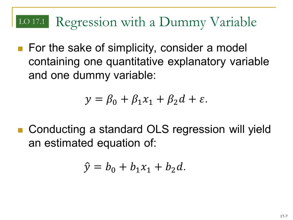 Chapter 17 Learning Objectives (LOs) LO 17.1:Use dummy variables to capture a shift of the intercept. LO 17.2:Test for differences between the categories of a qualitative variable. LO 17.3:Use dummy variables to capture a shift of the intercept and/or slope.