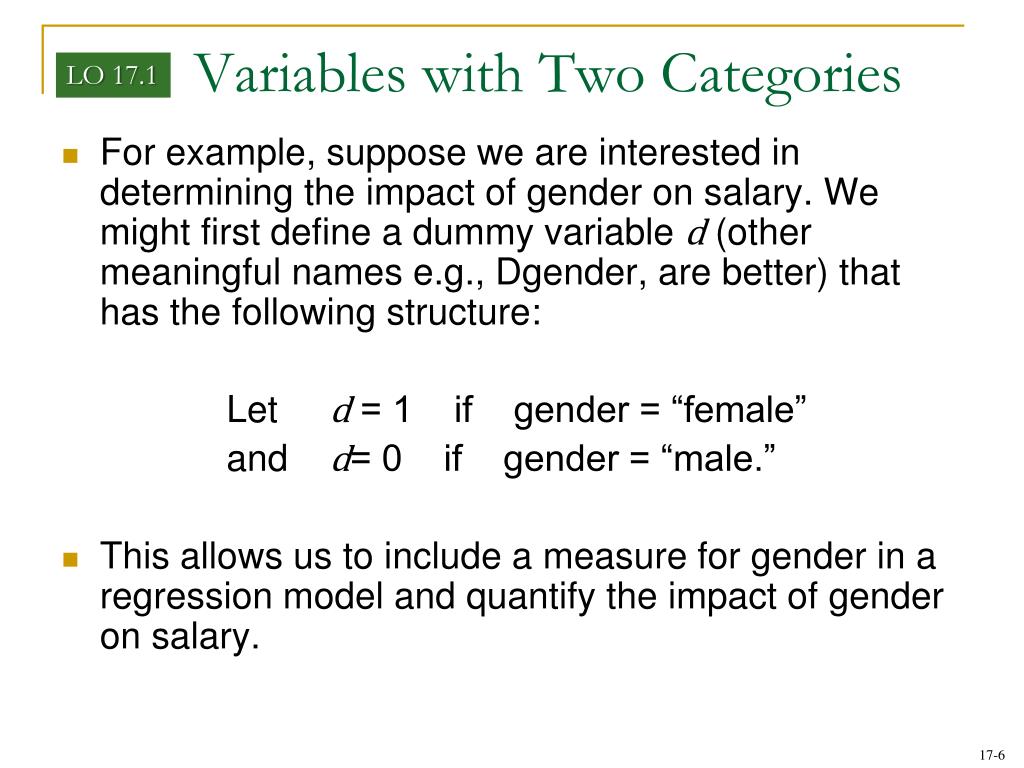 Variables with Two Categories LO 17.1 • For example, suppose we are interested in determining the impact of gender on salary. We might first define a dummy variable d (other meaningful names e.g., Dgender, are better) that has the following structure: Let d = 1 if gender = “female” and d= 0 if gender = “male.” • This allows us to include a measure for gender in a regression model and quantify the impact of gender on salary.