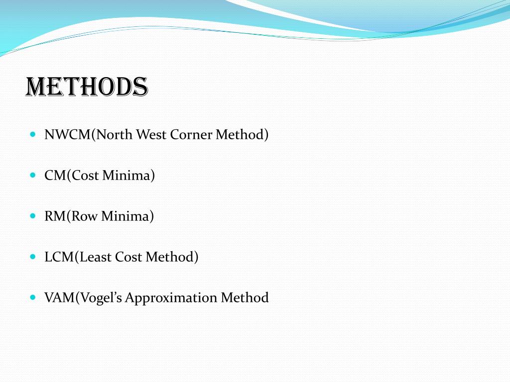 METHODS • NWCM(North West Corner Method) • CM(Cost Minima) • RM(Row Minima) • LCM(Least Cost Method) • VAM(Vogel’s Approximation Method