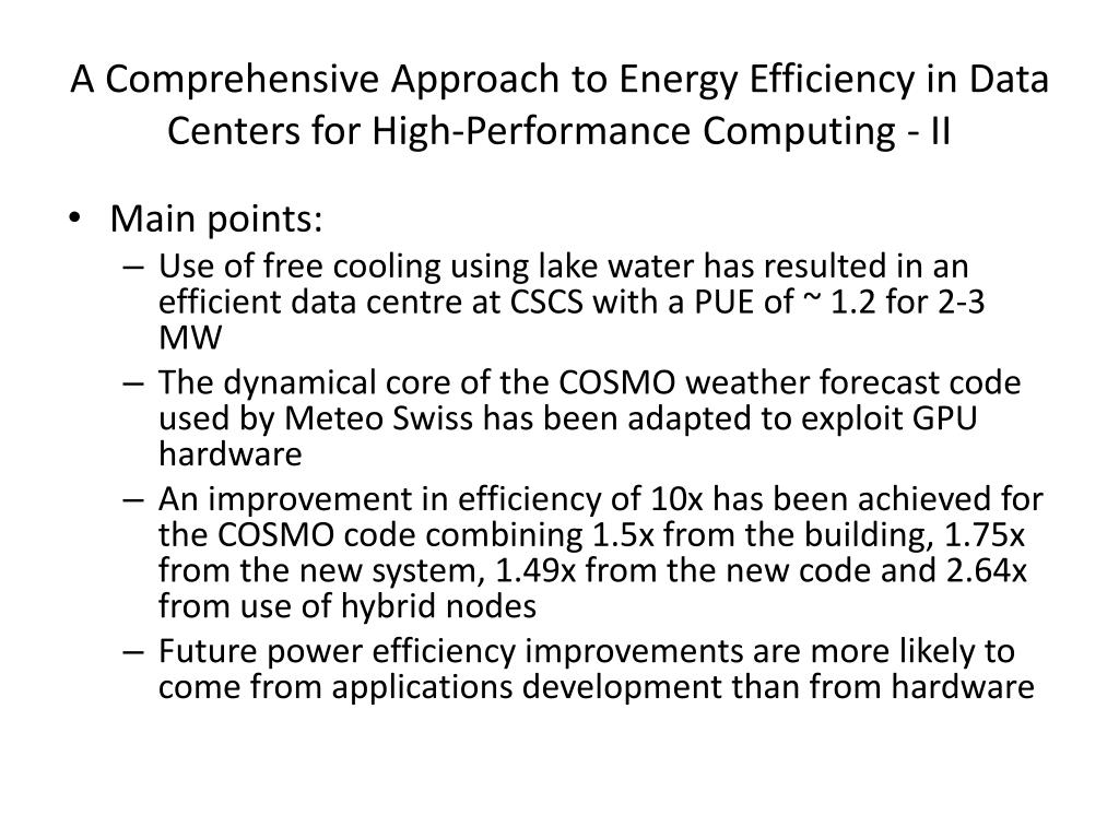 A Comprehensive Approach to Energy Efficiency in Data Centers for High-Performance Computing - II • Main points: • Use of free cooling using lake water has resulted in an efficient data centre at CSCS with a PUE of ~ 1.2 for 2-3 MW • The dynamical core of the COSMO weather forecast code used by Meteo Swiss has been adapted to exploit GPU hardware • An improvement in efficiency of 10x has been achieved for the COSMO code combining 1.5x from the building, 1.75x from the new system, 1.49x from the new code and 2.64x from use of hybrid nodes • Future power efficiency improvements are more likely to come from applications development than from hardware