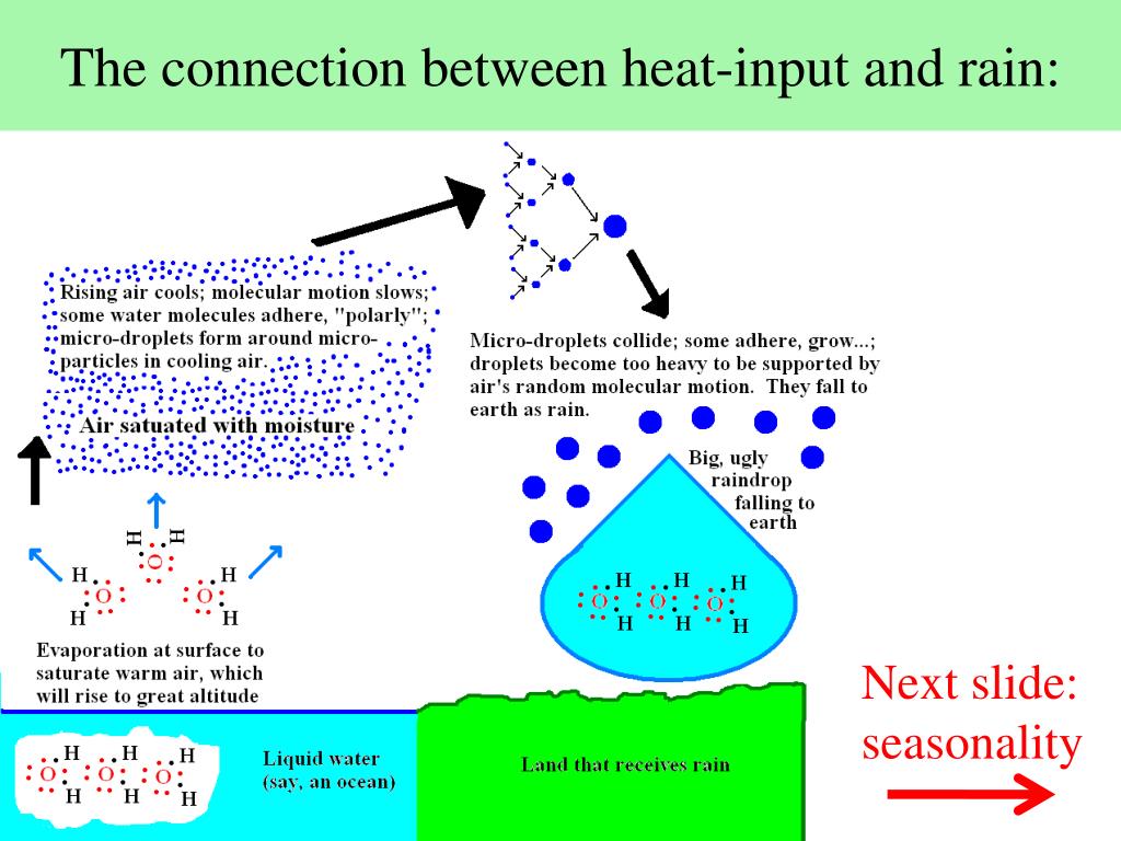 Thus we’ve seen that equatorial regions are often quite warm.They can also be very, very wet. • Here’s the deal: • Warm air over warm equatorial seas becomes saturated with moisture. • The warm air rises, and as it does so, it cools. • Water molecules & micro-droplets in the cooling air slow their random motion. • When some collide, they co-adhere and therefore increase in size. • When the droplets become so heavy that they cannot be supported by random molecular movement in air, they fall. • Convective rain occurs when warm, moist air rises, cools, and gets the water squeezed out of it. (See next slide.)