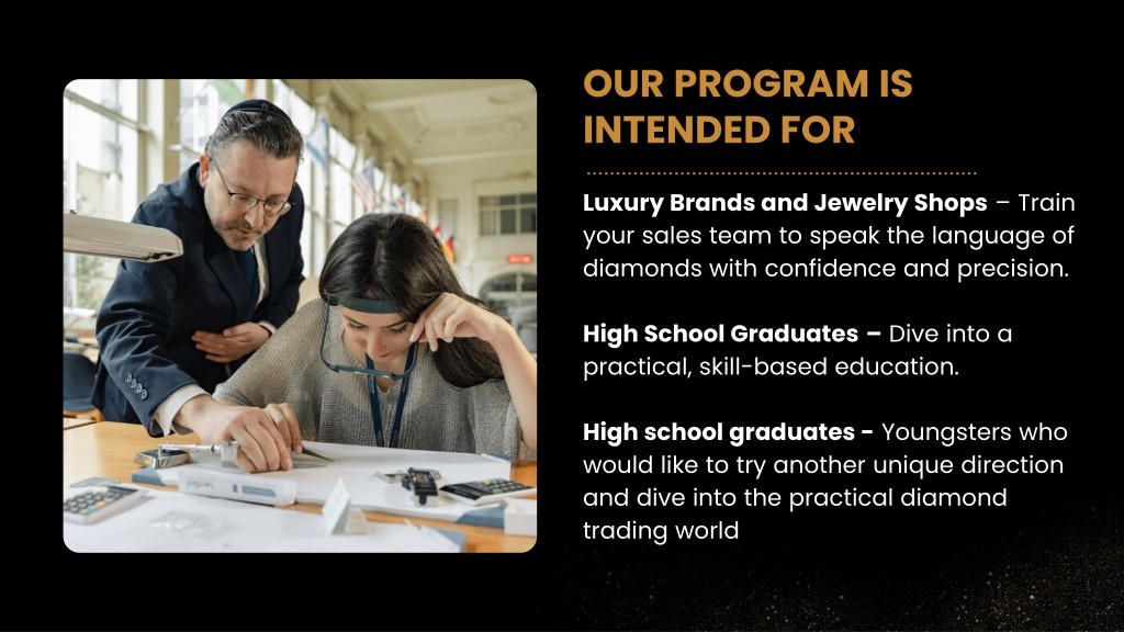 4. OUR PROGRAM IS INTENDED FOR Luxury Brands and Jewelry Shops – Train your sales team to speak the language of diamonds with confidence and precision. High School Graduates– Dive into a practical, skill-based education. High school graduates - Youngsters who would like to try another unique direction and dive into the practical diamond trading world