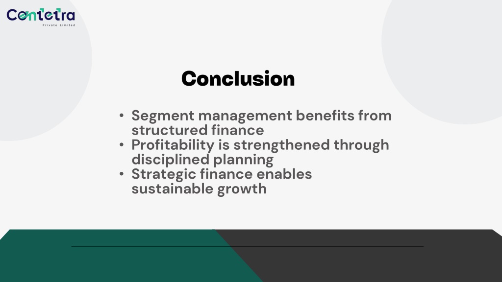 Conclusion • Segment management benefits from structured finance • Profitability is strengthened through disciplined planning • Strategic finance enables sustainable growth