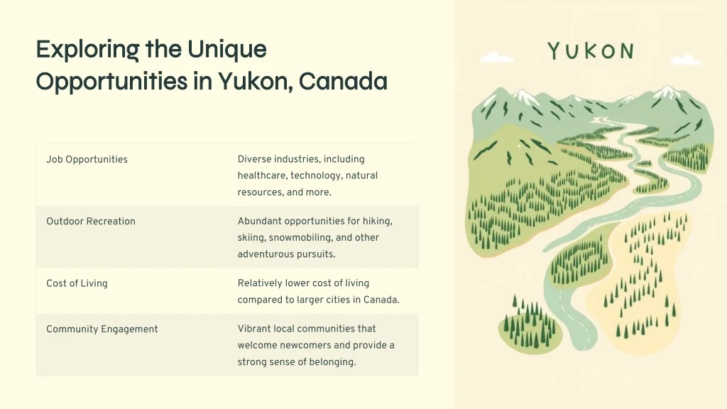 Exploring the Unique Exploring the Unique Opportunities in Yukon, Canada Opportunities in Yukon, Canada Diverse industries, including healthcare, technology, natural resources, and more. Job Opportunities Abundant opportunities for hiking, skiing, snowmobiling, and other adventurous pursuits. Outdoor Recreation Relatively lower cost of living compared to larger cities in Canada. Cost of Living Vibrant local communities that welcome newcomers and provide a strong sense of belonging. Community Engagement