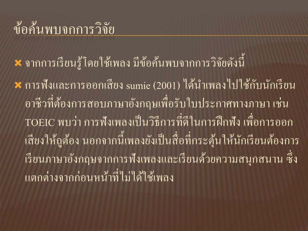 จากการเรียนรู้โดยใช้เพลง มีข้อค้นพบจากการวิจัยดังนี้ • การฟังและการออกเสียง sumie(2001) ได้นำเพลงไปใช้กับนักเรียนอาชีวที่ต้องการสอบภาษาอังกฤษเพื่อรับใบประกาศทางภาษา เช่น TOEIC พบว่า การฟังเพลงเป็นวิธีการที่ดีในการฝึกฟัง เพื่อการออกเสียงให้ถูต้อง นอกจากนี้เพลงยังเป็นสื่อที่กระตุ้นให้นักเรียนต้องการเรียนภาษาอังกฤษจากการฟังเพลงและเรียนด้วยความสนุกสนาน ซึ่งแตกต่างจากก่อนหน้าที่ไม่ได้ใช้เพลง ข้อค้นพบจกการวิจัย