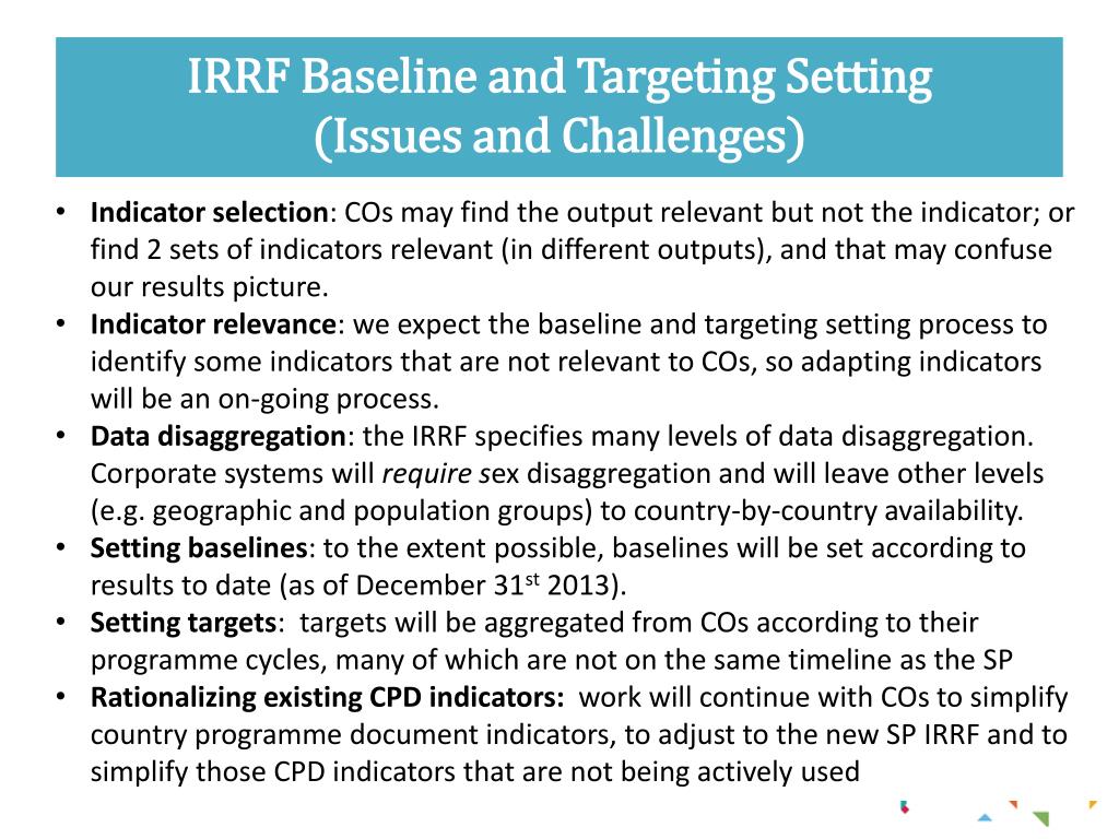 IRRF Baseline and Targeting Setting (Issues and Challenges) • Indicator selection: COs may find the output relevant but not the indicator; or find 2 sets of indicators relevant (in different outputs), and that may confuse our results picture. • Indicator relevance: we expect the baseline and targeting setting process to identify some indicators that are not relevant to COs, so adapting indicators will be an on-going process. • Data disaggregation: the IRRF specifies many levels of data disaggregation. Corporate systems will require sex disaggregation and will leave other levels (e.g. geographic and population groups) to country-by-country availability. • Setting baselines: to the extent possible, baselines will be set according to results to date (as of December 31st 2013). • Setting targets: targets will be aggregated from COs according to their programme cycles, many of which are not on the same timeline as the SP • Rationalizing existing CPD indicators: work will continue with COs to simplify country programme document indicators, to adjust to the new SP IRRF and to simplify those CPD indicators that are not being actively used