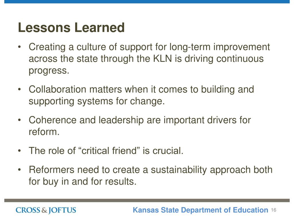 Lessons Learned • Creating a culture of support for long-term improvement across the state through the KLN is driving continuous progress. • Collaboration matters when it comes to building and supporting systems for change. • Coherence and leadership are important drivers for reform. • The role of “critical friend” is crucial. • Reformers need to create a sustainability approach both for buy in and for results.