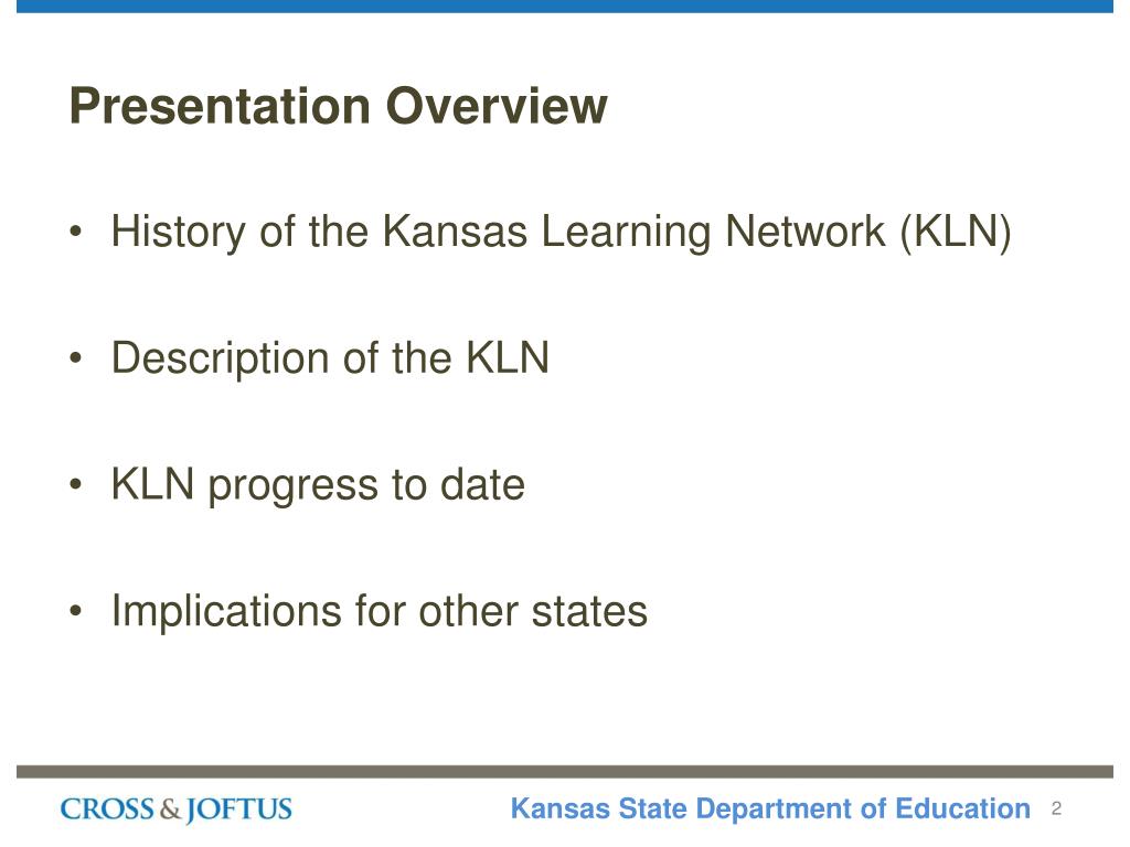 Presentation Overview • History of the Kansas Learning Network (KLN) • Description of the KLN • KLN progress to date • Implications for other states