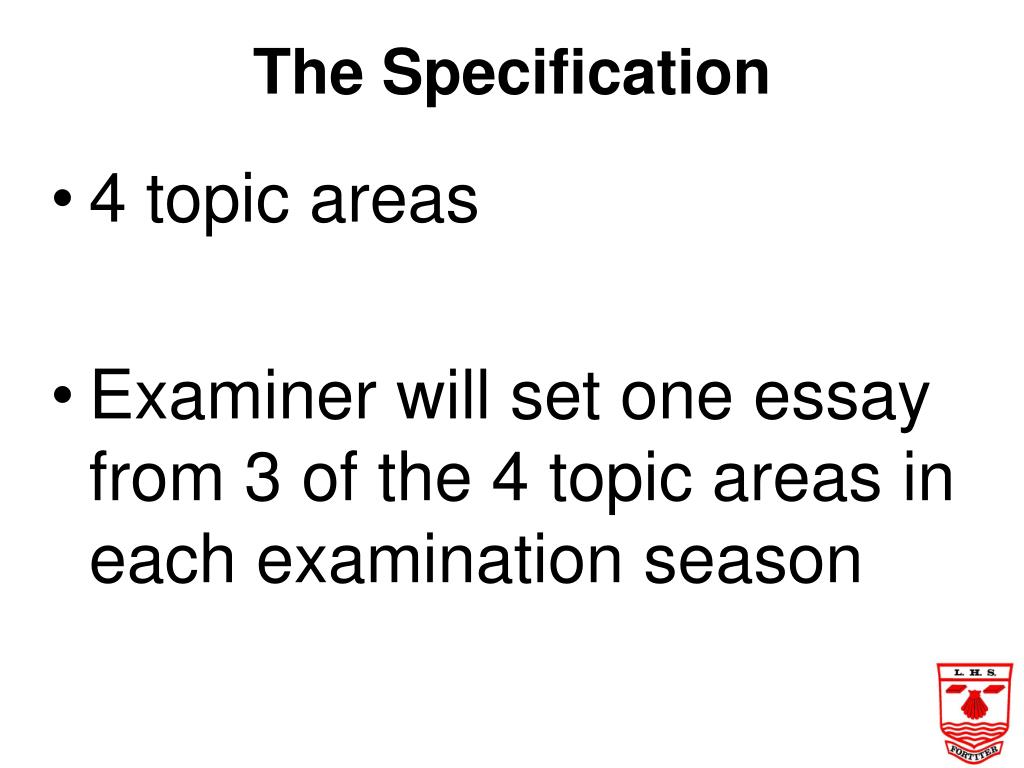 The Specification • 4 topic areas • Examiner will set one essay from 3 of the 4 topic areas in each examination season