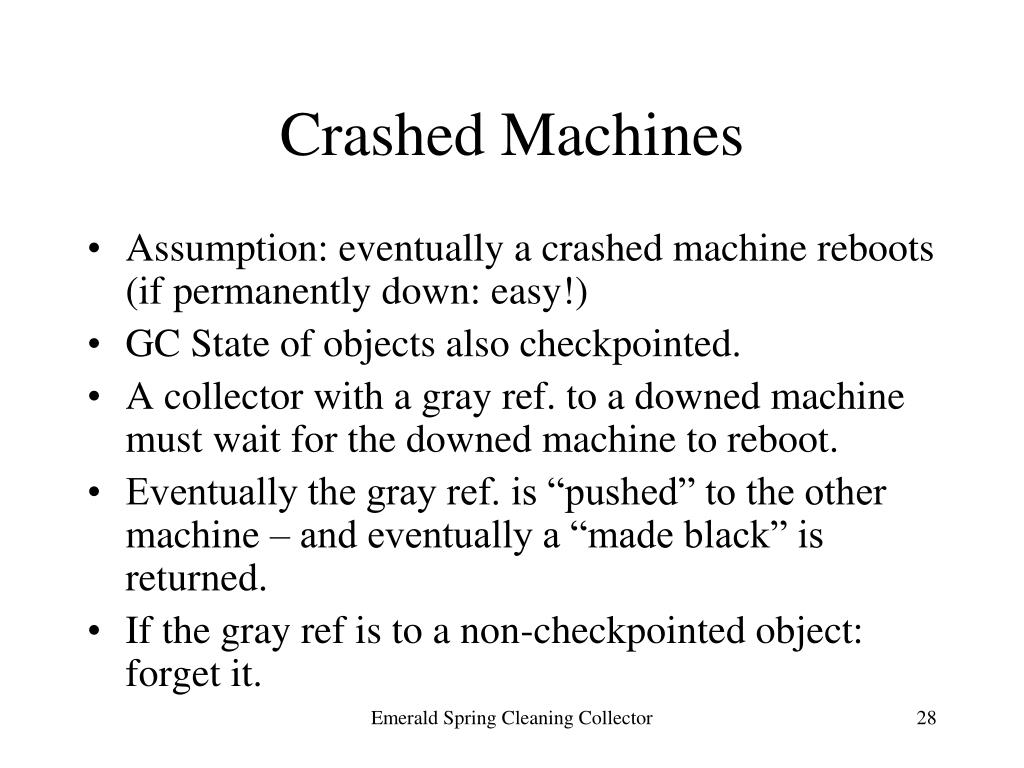 Crashed Machines • Assumption: eventually a crashed machine reboots (if permanently down: easy!) • GC State of objects also checkpointed. • A collector with a gray ref. to a downed machine must wait for the downed machine to reboot. • Eventually the gray ref. is “pushed” to the other machine – and eventually a “made black” is returned. • If the gray ref is to a non-checkpointed object: forget it. Emerald Spring Cleaning Collector