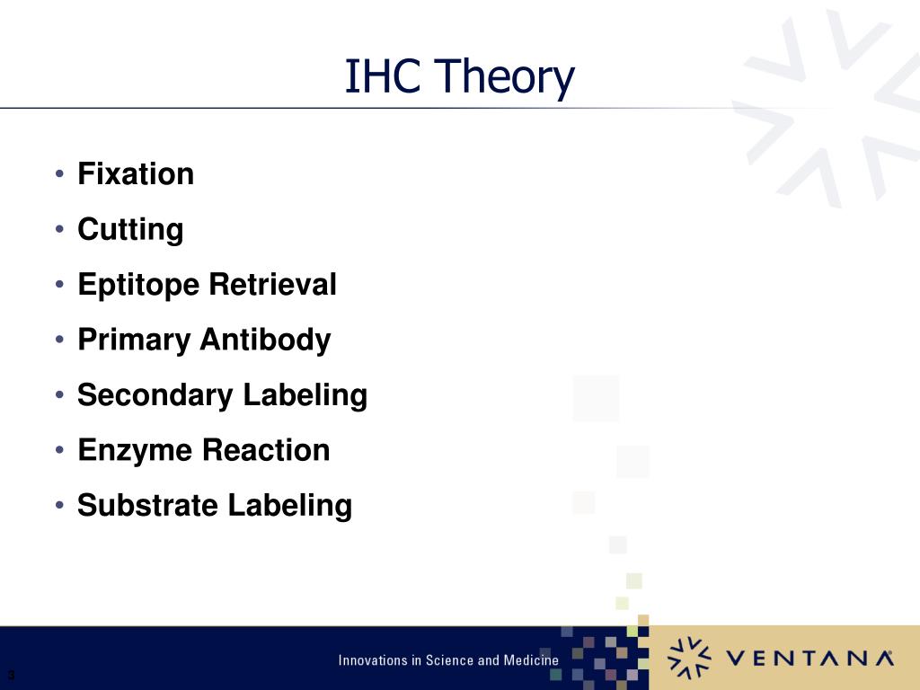 Welcome. Introduction to IHC A basic overview of theory and techniques relating to immunohistochemistry. History Theory Techniques Questions and Answers. IHC History. The principle of immunohistochemistry has existed since the 1930s