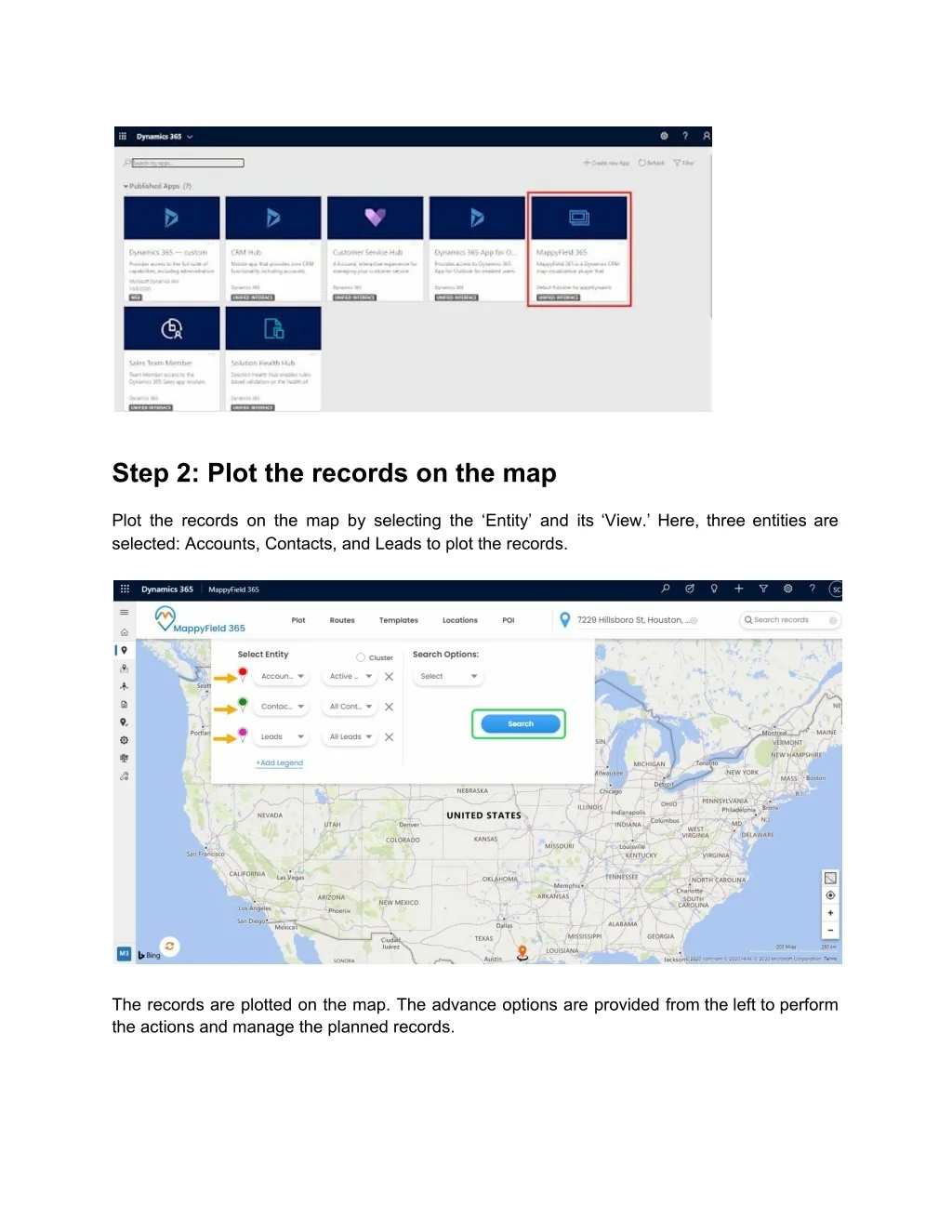 Step 2: Plot the records on the map Plot the records on the map by selecting the ‘Entity’ and its ‘View.’ Here, three entities are selected: Accounts, Contacts, and Leads to plot the records. The records are plotted on the map. The advance options are provided from the left to perform the actions and manage the planned records.