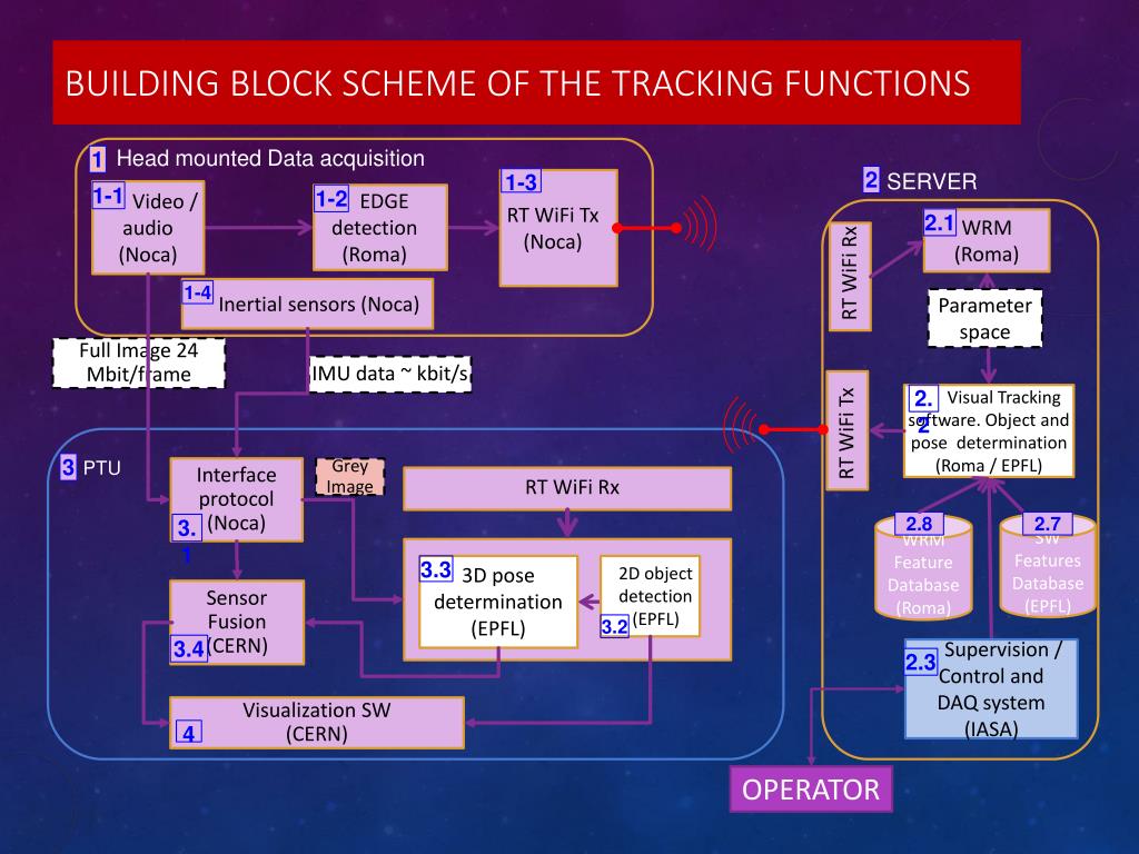 Video / audio (Noca) 1-1 EDGE detection (Roma) 1-2 1-3 RT WiFiTx (Noca) Building block scheme of the tracking functions 2.1 WRM (Roma) 2.7 SW FeaturesDatabase (EPFL) 2.8 WRM FeatureDatabase (Roma) Head mounted Data acquisition 1 Inertial sensors (Noca) 1-4 SERVER 2 RT WiFi Rx Visual Tracking software. Object and pose determination (Roma / EPFL) 2.2 Parameter space 2D objectdetection (EPFL) 3.3 3D pose determination (EPFL) Interface protocol (Noca) FullImage 24 Mbit/frame IMU data ~ kbit/s 3.2 3.1 RT WiFiTx Sensor Fusion (CERN) PTU 3 Supervision / Control and DAQ system (IASA) Grey Image 2.3 RT WiFi Rx 3.4 Visualization SW (CERN) 4 OPERATOR