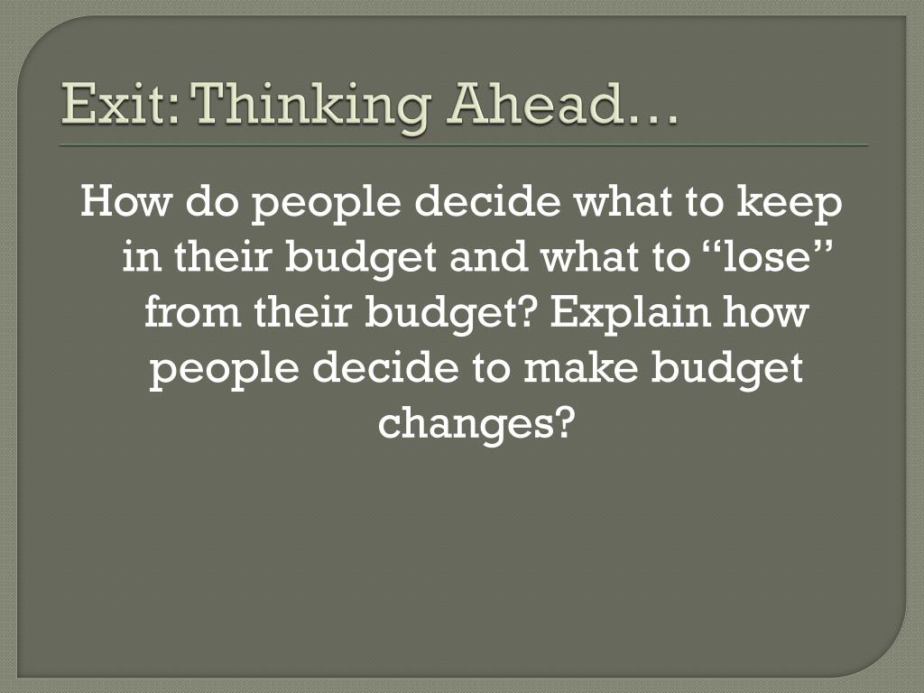 Exit: Thinking Ahead… How do people decide what to keep in their budget and what to “lose” from their budget? Explain how people decide to make budget changes?