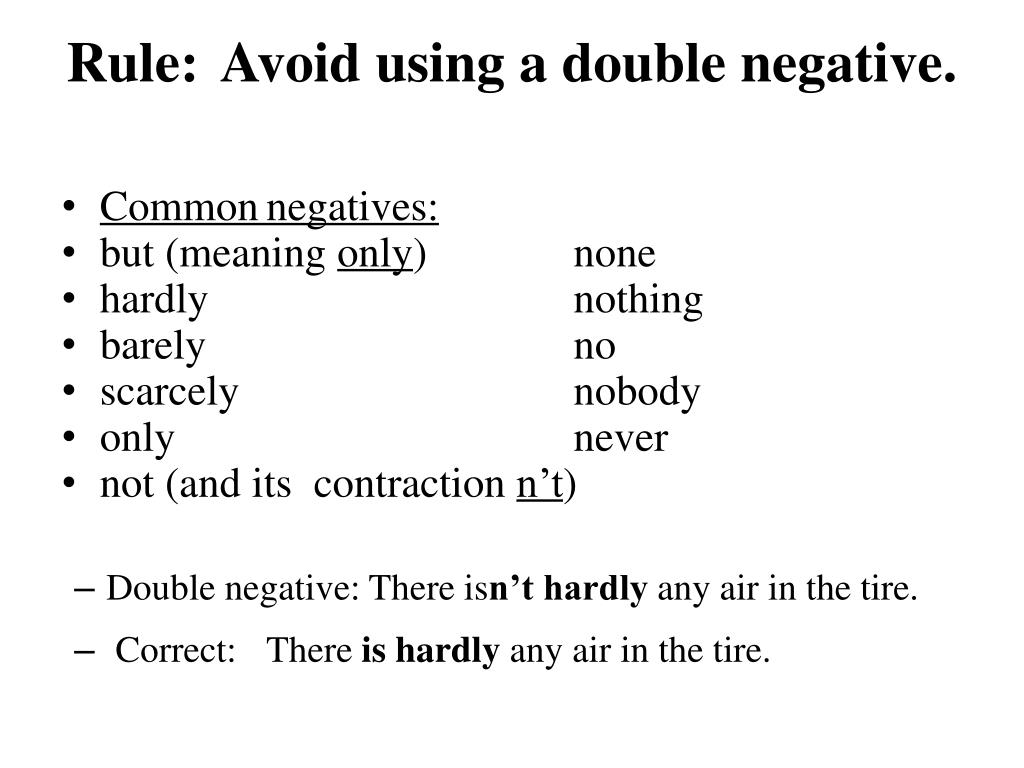 Rule: Avoid using a double negative. • Common negatives: • but (meaning only) none • hardly nothing • barely no • scarcely nobody • only never • not (and its contraction n’t) • Double negative: There isn’t hardly any air in the tire. • Correct: There is hardly any air in the tire.