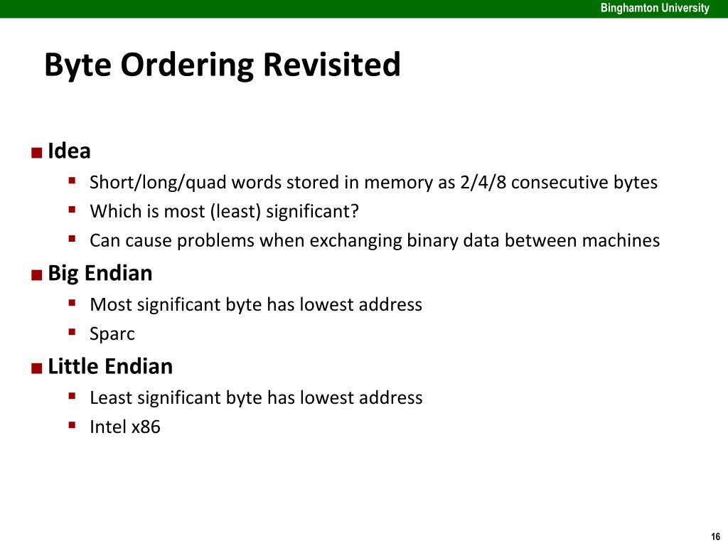 Byte Ordering Example union { unsigned char c[8]; unsigned short s[4]; unsigned inti[2]; unsigned long l[1]; } dw; 32-bit 64-bit
