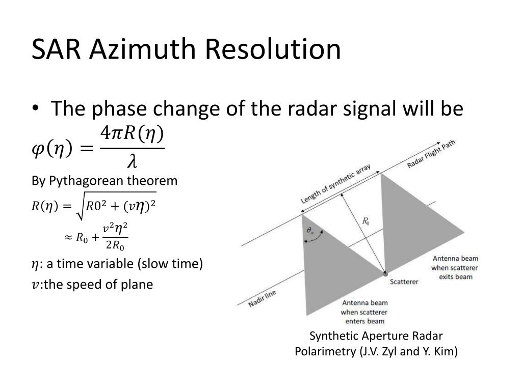 SAR Azimuth Resolution • The phase change of the radar signal will be By Pythagorean theorem : a time variable (slow time) :the speed of plane Synthetic Aperture Radar Polarimetry (J.V. Zyl and Y. Kim)