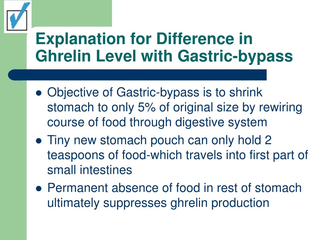 Explanation for Difference in Ghrelin Level with Gastric-bypass • Objective of Gastric-bypass is to shrink stomach to only 5% of original size by rewiring course of food through digestive system • Tiny new stomach pouch can only hold 2 teaspoons of food-which travels into first part of small intestines • Permanent absence of food in rest of stomach ultimately suppresses ghrelin production