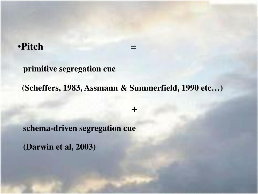 Pitch = • primitive segregation cue • (Scheffers, 1983, Assmann & Summerfield, 1990 etc…) • + • schema-driven segregation cue • (Darwin et al, 2003)