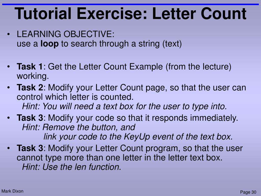 Tutorial Exercise: Letter Count • LEARNING OBJECTIVE:use a loop to search through a string (text) • Task 1: Get the Letter Count Example (from the lecture) working. • Task 2: Modify your Letter Count page, so that the user can control which letter is counted. Hint: You will need a text box for the user to type into. • Task 3: Modify your code so that it responds immediately. Hint: Remove the button, and link your code to the KeyUp event of the text box. • Task 3: Modify your Letter Count program, so that the user cannot type more than one letter in the letter text box.Hint: Use the len function.