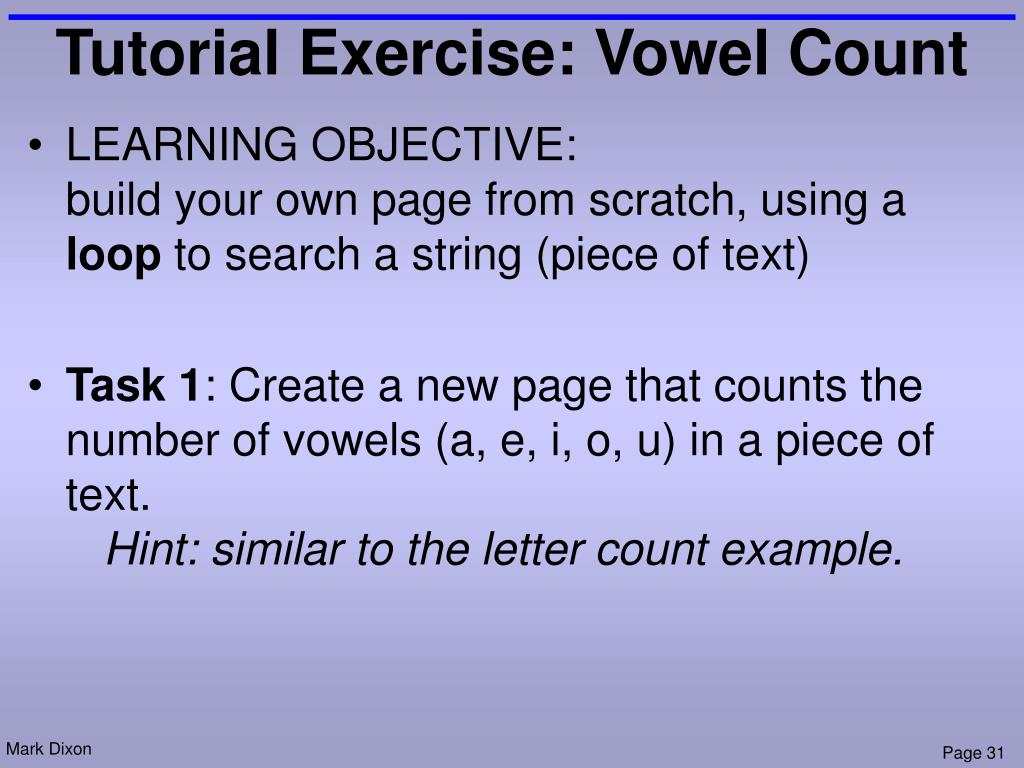 Tutorial Exercise: Vowel Count • LEARNING OBJECTIVE:build your own page from scratch, using a loop to search a string (piece of text) • Task 1: Create a new page that counts the number of vowels (a, e, i, o, u) in a piece of text.Hint: similar to the letter count example.