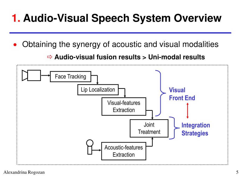 Face Tracking Visual Front End Lip Localization Visual-features Extraction Joint Treatment Integration Strategies Acoustic-features Extraction 1.Audio-Visual Speech System Overview • Obtaining the synergy of acoustic and visual modalities • Audio-visual fusion results > Uni-modal results Alexandrina Rogozan