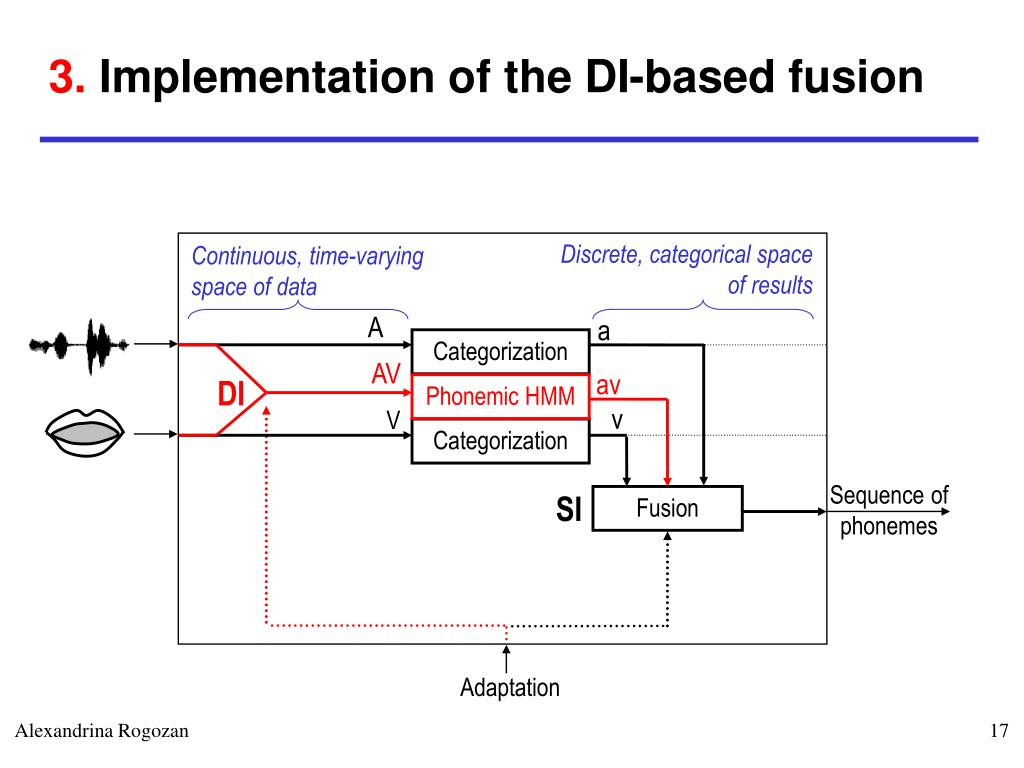 Discrete, categorical space of results Continuous, time-varying space of data A a Categorization AV av DI Phonemic HMM v V Categorization Sequence of phonemes SI Fusion Adaptation 3. Implementation of the DI-based fusion Alexandrina Rogozan