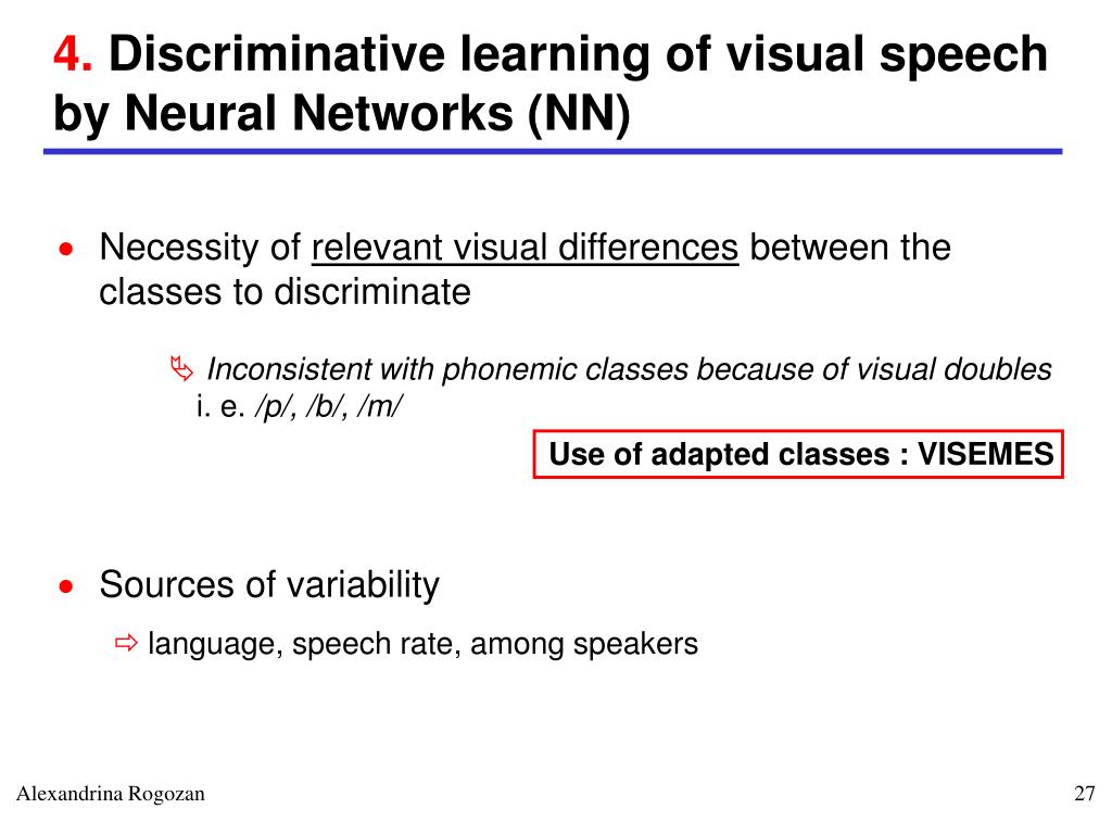 4. Discriminative learning of visual speech by Neural Networks (NN) • Necessity of relevant visual differences between the classes to discriminate • Inconsistent with phonemic classes because of visual doubles i. e. /p/, /b/, /m/ • Use of adapted classes : VISEMES • Sources of variability • language, speech rate, among speakers Alexandrina Rogozan