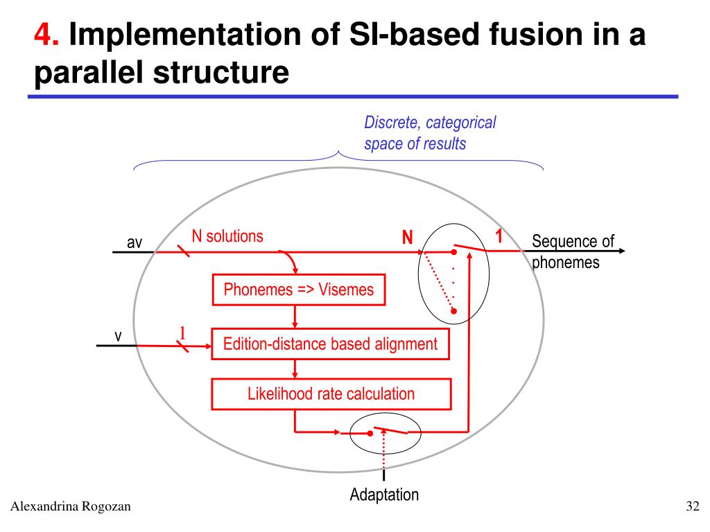 Discrete, categorical space of results 1 N solutions N Sequence of phonemes av . . . Phonemes => Visemes 1 v Edition-distance based alignment Likelihood rate calculation Adaptation 4. Implementation of SI-based fusion in a parallel structure Alexandrina Rogozan