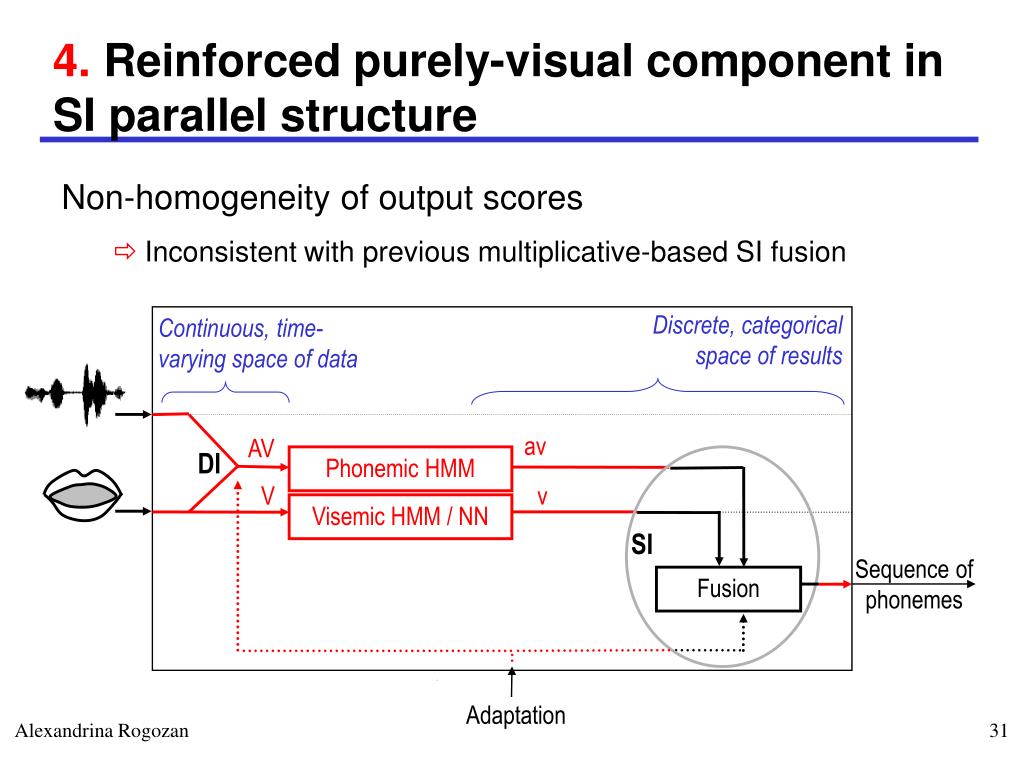 Discrete, categorical space of results Continuous, time-varying space of data av AV DI Phonemic HMM V v Visemic HMM / NN SI Sequence of phonemes Fusion Adaptation 4. Reinforced purely-visual component in SI parallel structure Non-homogeneity of output scores • Inconsistent with previous multiplicative-based SI fusion Alexandrina Rogozan