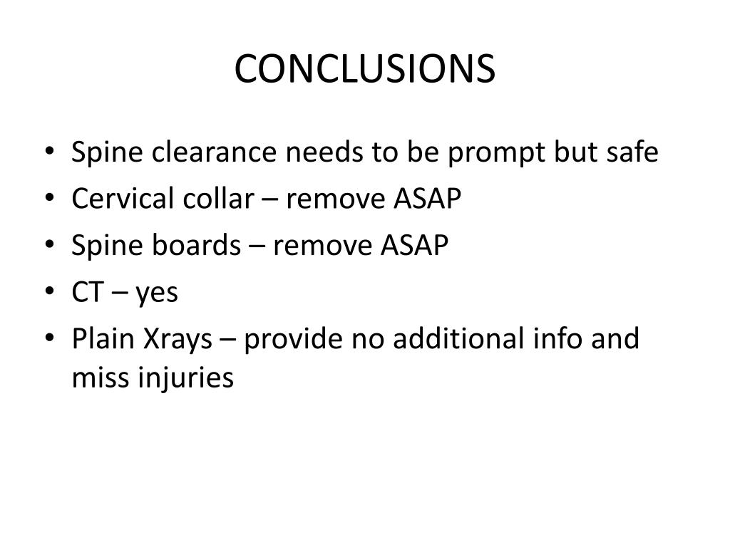 CONCLUSIONS • Spine clearance needs to be prompt but safe • Cervical collar – remove ASAP • Spine boards – remove ASAP • CT – yes • Plain Xrays – provide no additional info and miss injuries