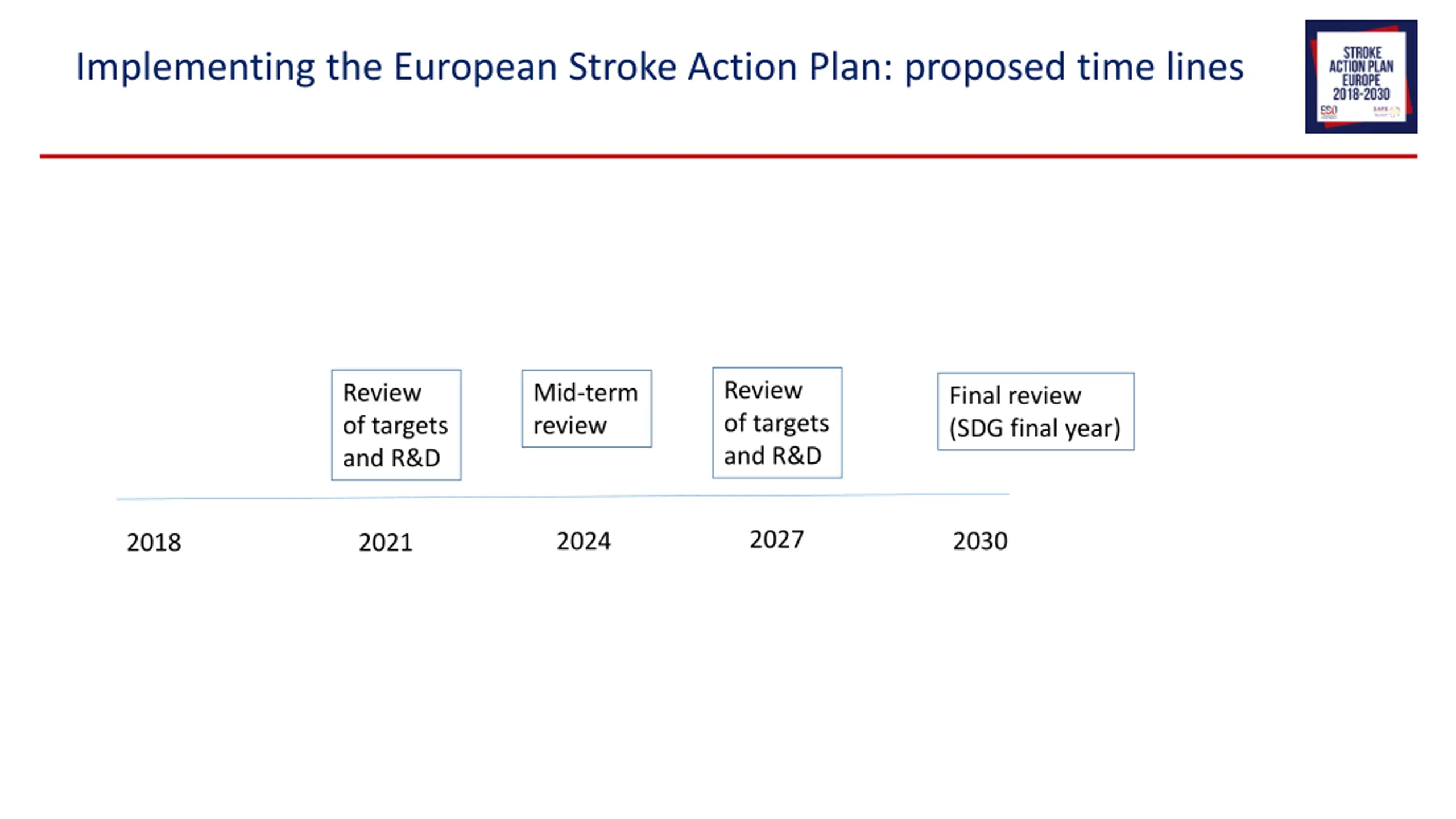 Implementing the European Stroke Action Plan: proposed time lines Review of targets and R&D Review of targets and R&D Mid-term review Final review (SDG final year) 2027 2024 2030 2018 2021