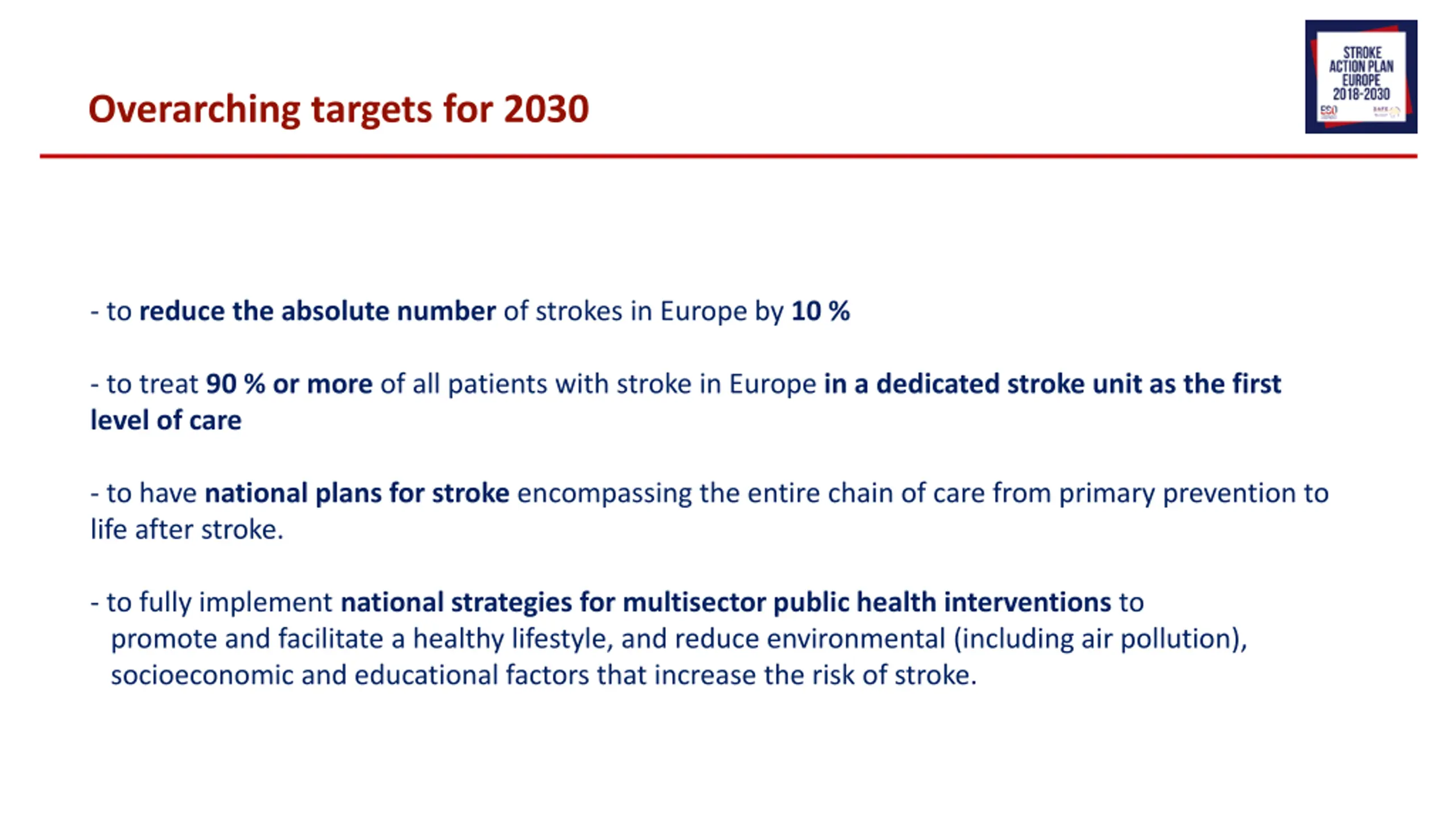 Overarching targets for 2030 - to reduce the absolute number of strokes in Europe by 10 % - to treat 90 % or more of all patients with stroke in Europe in a dedicated stroke unit as the first level of care - to have national plans for stroke encompassing the entire chain of care from primary prevention to life after stroke. - to fully implement national strategies for multisector public health interventions to promote and facilitate a healthy lifestyle, and reduce environmental (including air pollution), socioeconomic and educational factors that increase the risk of stroke.