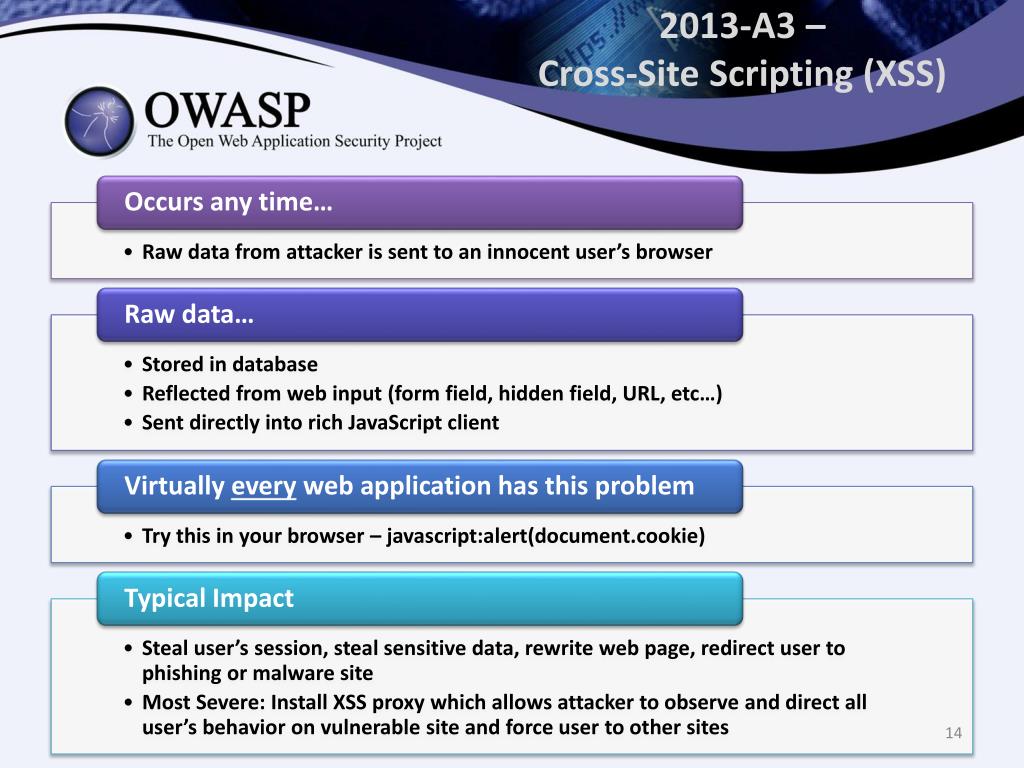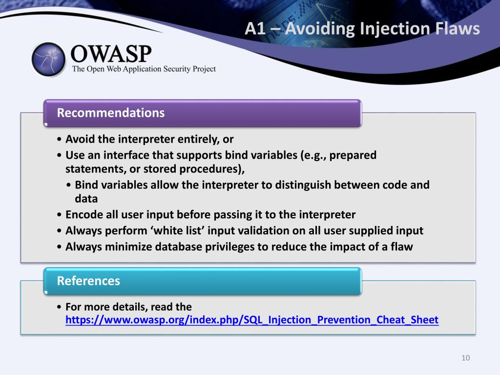 OWASP Top-10 2013. Dave Wichers OWASP Top 10 Project Lead OWASP Board Member COO/Cofounder, Aspect Security. About the OWASP Top 10. OWASP Top Ten (2013 Edition). What Didn’t Change. OWASP Top 10 Risk Rating Methodology. 1 2 3. Injection Example. 1.66 weighted risk rating.