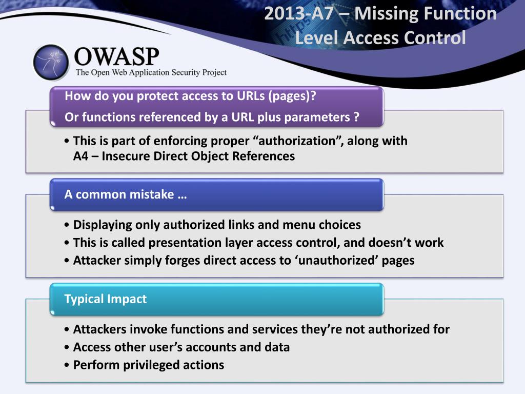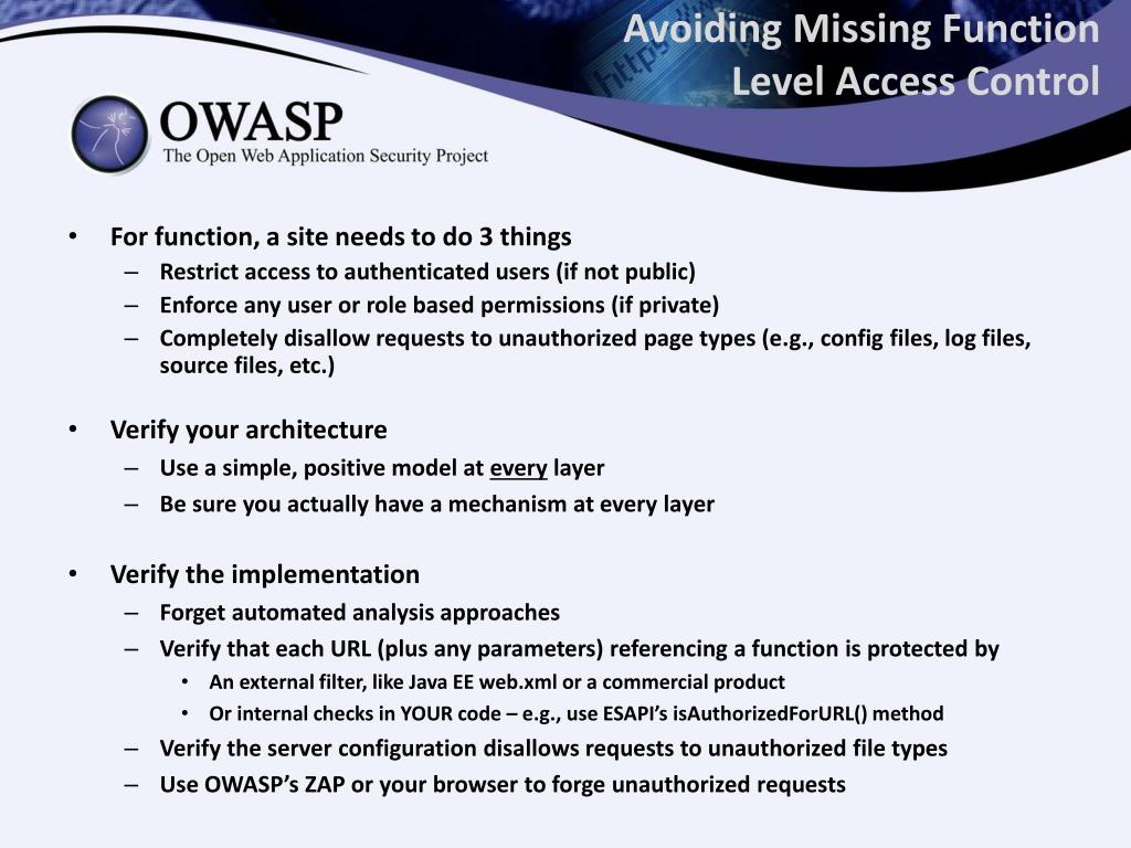 Avoiding Missing Function Level Access Control • For function, a site needs to do 3 things • Restrict access to authenticated users (if not public) • Enforce any user or role based permissions (if private) • Completely disallow requests to unauthorized page types (e.g., config files, log files, source files, etc.) • Verify your architecture • Use a simple, positive model at every layer • Be sure you actually have a mechanism at every layer • Verify the implementation • Forget automated analysis approaches • Verify that each URL (plus any parameters) referencing a function is protected by • An external filter, like Java EE web.xml or a commercial product • Or internal checks in YOUR code – e.g., use ESAPI’s isAuthorizedForURL() method • Verify the server configuration disallows requests to unauthorized file types • Use OWASP’s ZAP or your browser to forge unauthorized requests