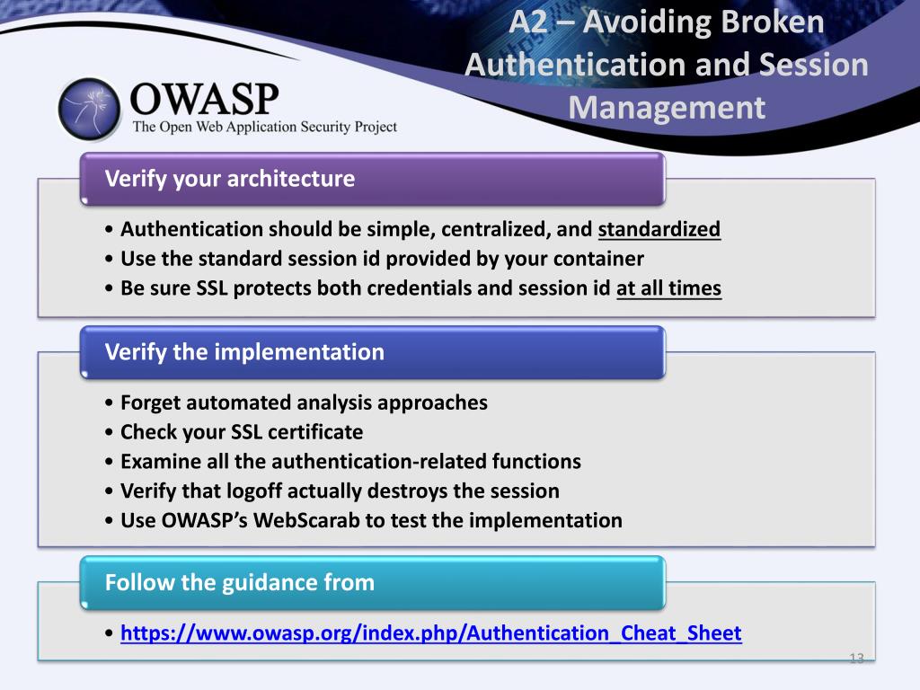 Summary: How do you address these problems? • Develop Secure Code • Follow the best practices in OWASP’s Guide to Building Secure Web Applications • https://www.owasp.org/index.php/Guide • And the cheat sheets: https://www.owasp.org/index.php/Cheat_Sheets • Use OWASP’s Application Security Verification Standard as a guide to what an application needs to be secure • https://www.owasp.org/index.php/ASVS • Use standard security components that are a fit for your organization • Use OWASP’s ESAPI as a basis for your standard components • https://www.owasp.org/index.php/ESAPI • Review Your Applications • Have an expert team review your applications • Review your applications yourselves following OWASP Guidelines • OWASP Code Review Guide: https://www.owasp.org/index.php/Code_Review_Guide • OWASP Testing Guide: https://www.owasp.org/index.php/Testing_Guide