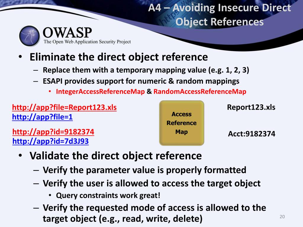 A4 – Avoiding Insecure Direct Object References Access Reference Map • Eliminate the direct object reference • Replace them with a temporary mapping value (e.g. 1, 2, 3) • ESAPI provides support for numeric & random mappings • IntegerAccessReferenceMap& RandomAccessReferenceMap • Validate the direct object reference • Verify the parameter value is properly formatted • Verify the user is allowed to access the target object • Query constraints work great! • Verify the requested mode of access is allowed to the target object (e.g., read, write, delete) Report123.xls http://app?file=Report123.xls http://app?file=1 http://app?id=9182374 Acct:9182374 http://app?id=7d3J93