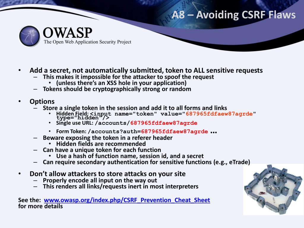 A8 – Avoiding CSRF Flaws • Add a secret, not automatically submitted, token to ALL sensitive requests • This makes it impossible for the attacker to spoof the request • (unless there’s an XSS hole in your application) • Tokens should be cryptographically strong or random • Options • Store a single token in the session and add it to all forms and links • Hidden Field: <input name="token" value="687965fdfaew87agrde" type="hidden"/> • Single use URL: /accounts/687965fdfaew87agrde • Form Token: /accounts?auth=687965fdfaew87agrde… • Beware exposing the token in a referer header • Hidden fields are recommended • Can have a unique token for each function • Use a hash of function name, session id, and a secret • Can require secondary authentication for sensitive functions (e.g., eTrade) • Don’t allow attackers to store attacks on your site • Properly encode all input on the way out • This renders all links/requests inert in most interpreters See the: www.owasp.org/index.php/CSRF_Prevention_Cheat_Sheet for more details
