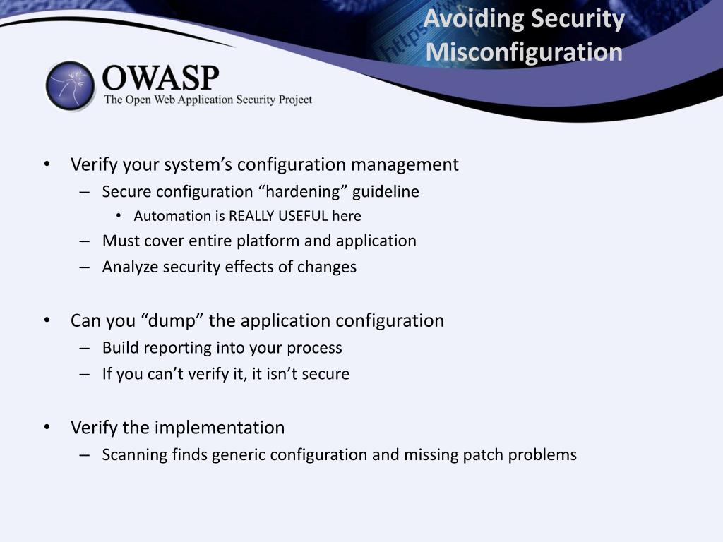 Avoiding Security Misconfiguration • Verify your system’s configuration management • Secure configuration “hardening” guideline • Automation is REALLY USEFUL here • Must cover entire platform and application • Analyze security effects of changes • Can you “dump” the application configuration • Build reporting into your process • If you can’t verify it, it isn’t secure • Verify the implementation • Scanning finds generic configuration and missing patch problems