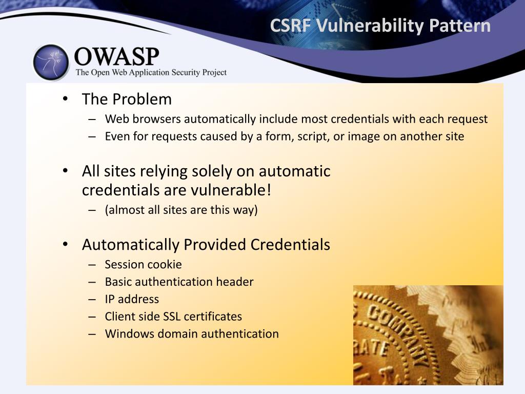 The Problem Web browsers automatically include most credentials with each request Even for requests caused by a form, script, or image on another site All sites relying solely on automatic credentials are vulnerable! (almost all sites are this way) Automatically Provided Credentials Session cookie Basic authentication header IP address Client side SSL certificates Windows domain authentication CSRF Vulnerability Pattern