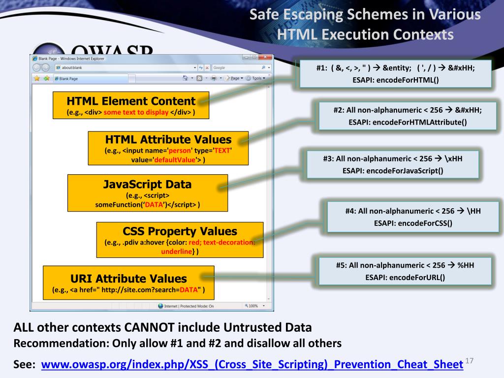 Safe Escaping Schemes in Various HTML Execution Contexts #1: ( &, <, >, " ) &entity; ( ', / ) &#xHH; ESAPI: encodeForHTML() HTML Element Content • (e.g., <div> some text to display </div> ) #2: All non-alphanumeric < 256 &#xHH; ESAPI: encodeForHTMLAttribute() HTML Attribute Values • (e.g., <input name='person' type='TEXT' value='defaultValue'> ) #3: All non-alphanumeric < 256 \xHH ESAPI: encodeForJavaScript() JavaScript Data (e.g., <script>someFunction(‘DATA’)</script> ) #4: All non-alphanumeric < 256 \HH ESAPI: encodeForCSS() CSS Property Values • (e.g., .pdiv a:hover {color: red; text-decoration: underline} ) #5: All non-alphanumeric < 256 %HH ESAPI: encodeForURL() URI Attribute Values • (e.g., <a href=" http://site.com?search=DATA" ) ALL other contexts CANNOT include Untrusted Data Recommendation: Only allow #1 and #2 and disallow all others See: www.owasp.org/index.php/XSS_(Cross_Site_Scripting)_Prevention_Cheat_Sheet