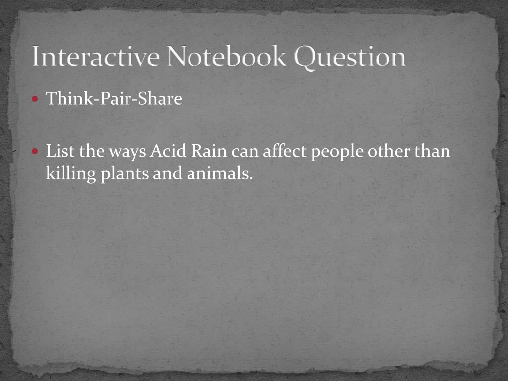 Interactive Notebook Question • Think-Pair-Share • List the ways Acid Rain can affect people other than killing plants and animals.