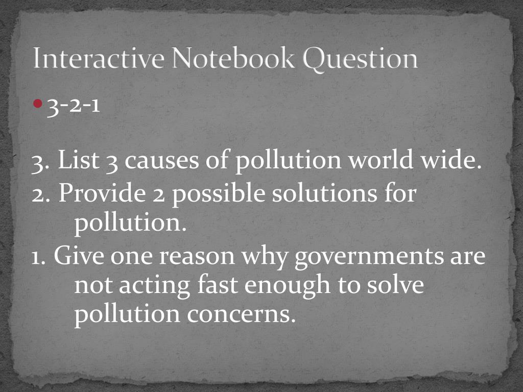 Interactive Notebook Question • 3-2-1 3. List 3 causes of pollution world wide. 2. Provide 2 possible solutions for pollution. 1. Give one reason why governments are not acting fast enough to solve pollution concerns.