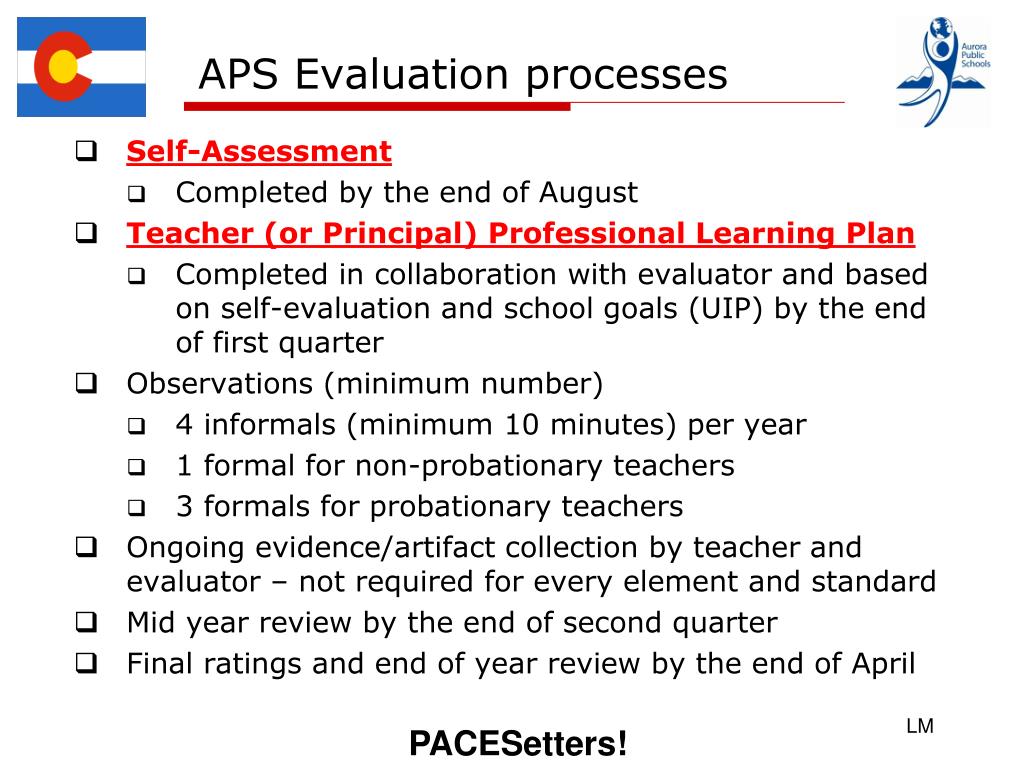 APS Evaluation processes • Self-Assessment • Completed by the end of August • Teacher (or Principal) Professional Learning Plan • Completed in collaboration with evaluator and based on self-evaluation and school goals (UIP) by the end of first quarter • Observations (minimum number) • 4 informals (minimum 10 minutes) per year • 1 formal for non-probationary teachers • 3 formals for probationary teachers • Ongoing evidence/artifact collection by teacher and evaluator – not required for every element and standard • Mid year review by the end of second quarter • Final ratings and end of year review by the end of April LM