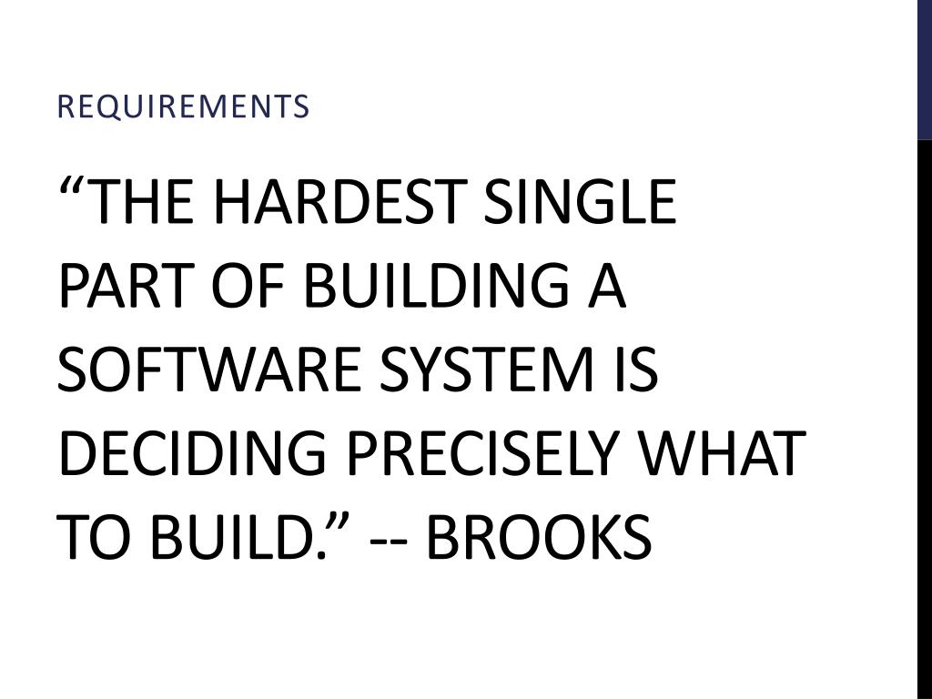 Requirements “The hardest Single part of building a software System is deciding precisely what to build.” -- Brooks