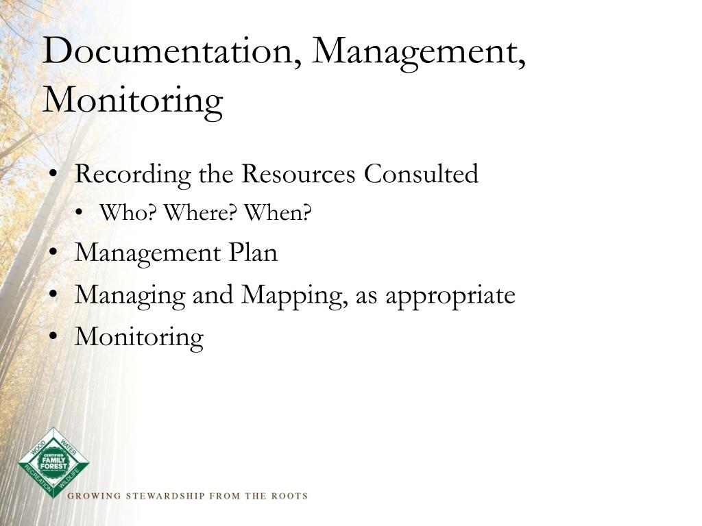 Documentation, Management, Monitoring • Recording the Resources Consulted • Who? Where? When? • Management Plan • Managing and Mapping, as appropriate • Monitoring