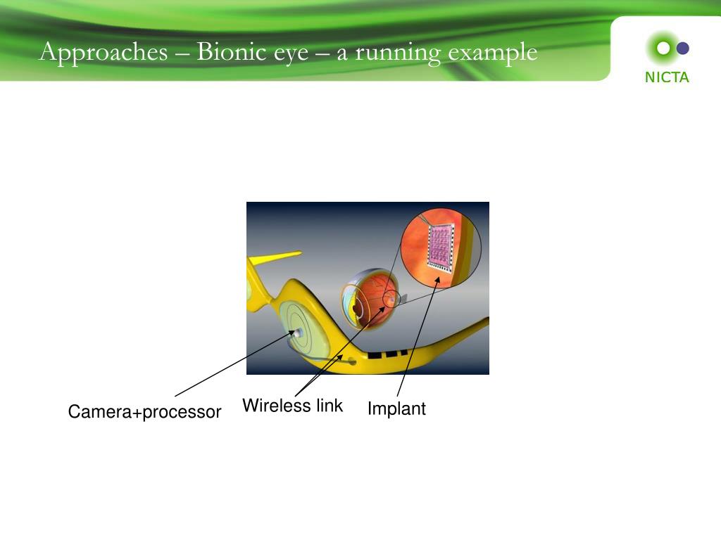 Approaches – Bionic eye – a running example Wireless link Implant Camera+processor